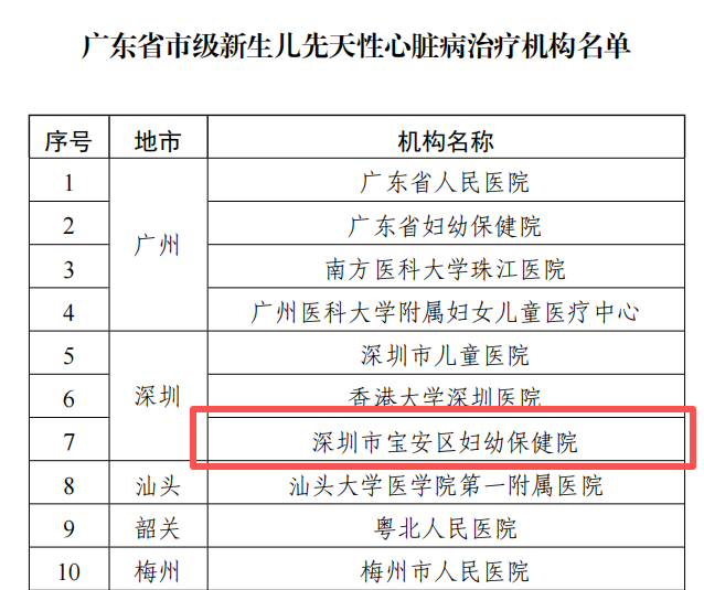 咨询电话:近日,广东省卫生健康委公布全省新生儿先天性心脏病筛查与诊治机构名单。深圳市宝安区妇幼保健院被正式确定为“广东省市级新生儿先天性心脏病诊断机构”及“广东省市级新生儿先天性心脏病治疗机构”,成为省级防治网络中的重要节点。