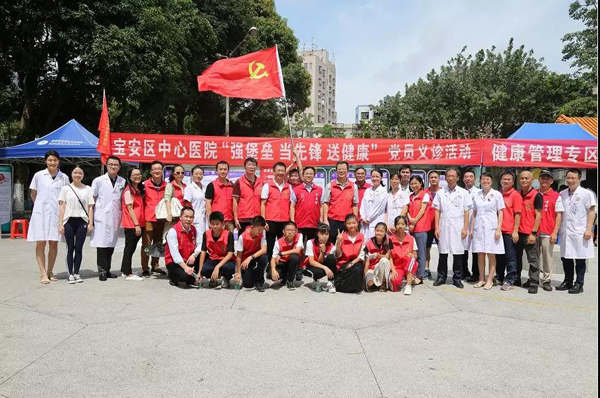“七一”前夕,宝安区中心医院党委组织临床、社康、行政后勤12个党支部党员干部、临床专家和志愿者在宝安区西乡公园开展了“强堡垒 当先锋 送健康”党员义诊活动,来自内科、外科、妇科、儿科、全科、急诊科、健康体检中心、营养科及双龙社康30余名专家医师们参加了此次活动,服务市民500多人次,用实际行动向党的98岁生日献礼。