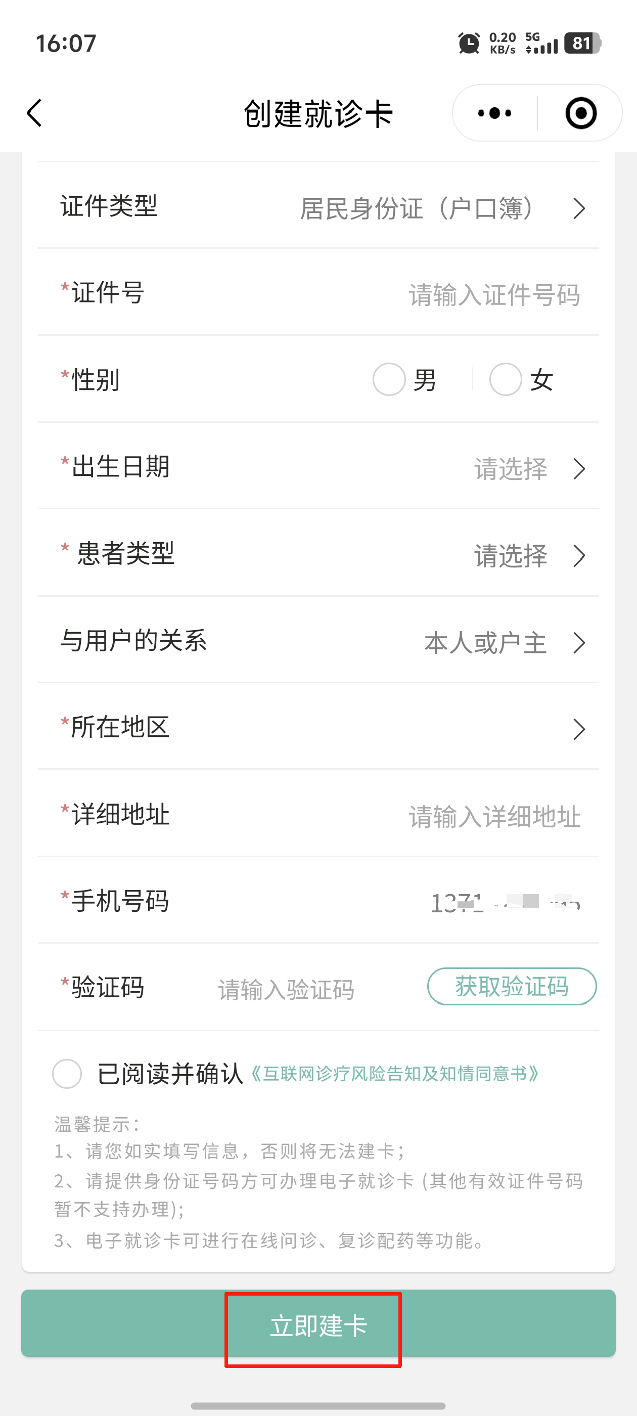 2、新增患者信息:点击“添加就诊人”,选择“创建电子就诊卡”,录入就诊人信息后点击“立即建卡”即可。