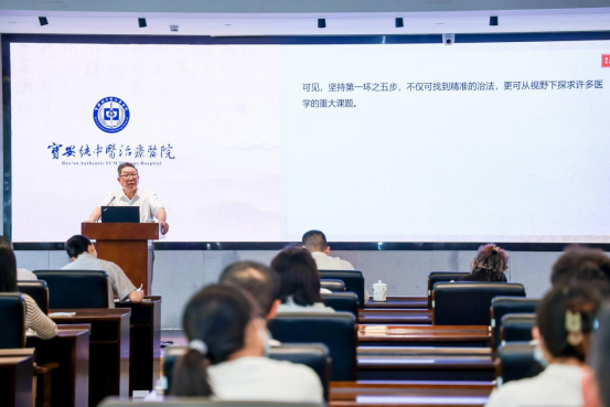 在“做临床”环节,他阐述了“思、悟、炼、创、旁”五步:强调中医思维的核心地位,必须遵循中医理论体系,克服浅表与僵化思维;注重临床领悟力的培养,能理解文字背后的深意;提升从复杂病情和前人论述中提炼关键信息的能力;在坚实继承基础上勇于进行临床方法创新;并具备融合天时、地理、社会等人文自然知识的跨学科视野。刘教授指出,临床是中医的生命,只有坚持临床,才能说进一步的发展。