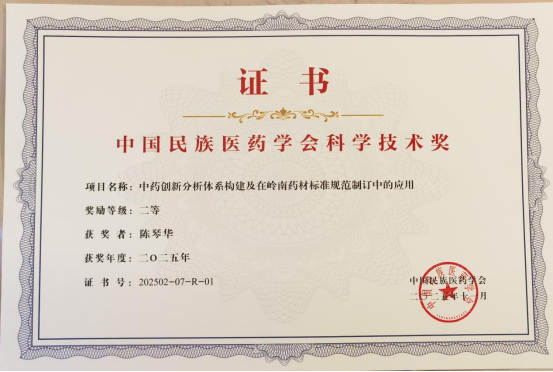 近日,我院药学部凭借“中药创新分析体系构建及在岭南药材标准规范制订中的应用”项目,以第一完成单位荣获2025年度中国民族医药学会科学技术奖二等奖。这一奖项是对我院在中医药创新研究与标准化建设领域突出贡献的高度认可,标志着我院在中药质量控制和国际化推广方面取得重大突破。